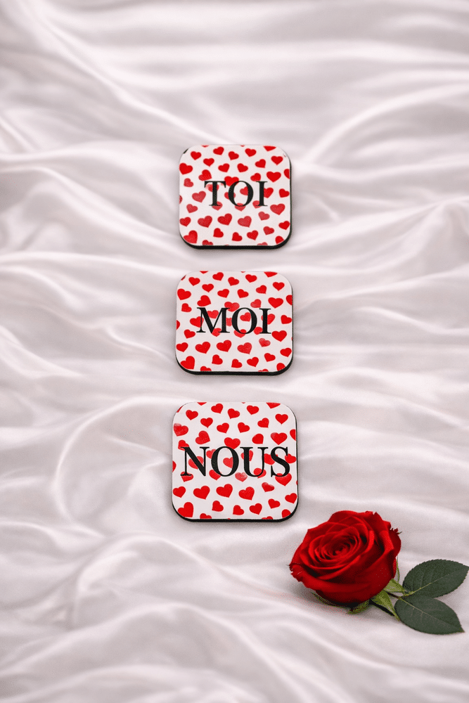 Trois mots simples, mais tout un symbole ❤️ Ce trio d’aimants TOI, MOI et NOUS est une jolie façon de célébrer l’amour au quotidien.À poser sur le frigo, un tableau ou toute surface aimantée, ils rappellent chaque jour le lien qui unit deux personnes. Avec leurs motifs de cœurs rouges et leur design assorti à…